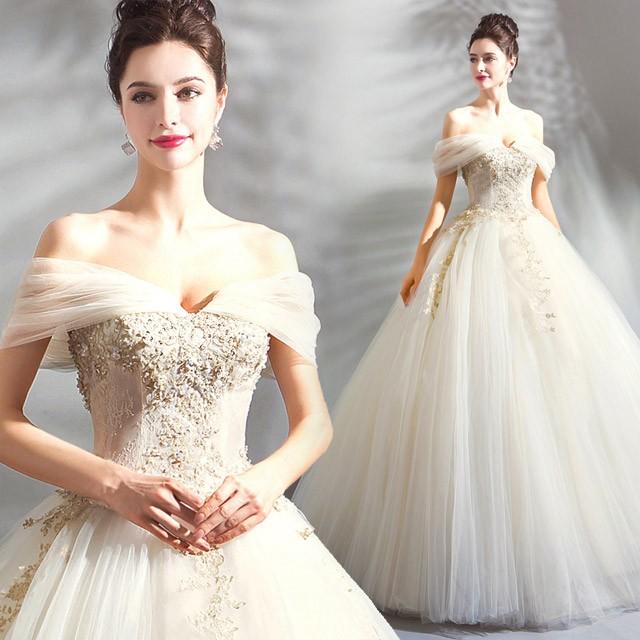 ウェディングドレス オフショルダー Aライン ロング丈 ロングドレス チュール 結婚式ドレス 豪華 キレイめ ドレス 披露宴 挙式 花嫁ドレス 編み上げ Lh Kittyshop 通販 Yahoo ショッピング